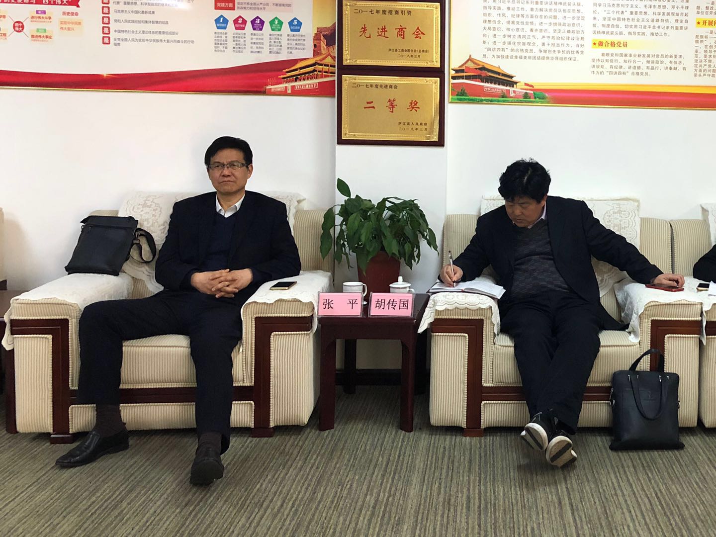 随后,考察团来到商会与商会企业家代表进行了座谈。会上,常州合肥商会执行会长、庐江县驻常州流动党委书记杨德传对汪主席一行莅临商会指导表示热烈的欢迎和衷心的感谢,并向考察团一行汇报工作。1、对常州合肥商会发展历程、组织架构及会员分布等情况介绍。商会在过去的三年里,在加强商会班子建设、加强与两地政府联动、外出学习考察活动、慈善公益等方面做出了一些有影响力的工作和成绩;2、对近年来党建工作情况作了汇报。随着庐江县驻常州流动党员队伍的不断壮大,建立了流动党员登记簿,加强了阵地建设,开展了各项学习活动,培养优秀了党员和入党积极分子;3、对商会“以商养会”模式成果汇报。常州常合商贸股份有限公司成立以来,商会不再以会费为唯一经费来源;从目前经营情况看,既用活了会员股东的暂时闲置资金,商会日常活动也得到了商贸公司的大力支持,又为商会及会员企业节约了开支,会员股东每年都能有应得的分红。考察团一行在听完汇报后,对常州合肥商会自成立以来所取得的成绩以及对社会所做的贡献给予了充分肯定。